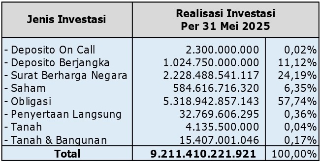 Realisasi hasil investasi yang berhasil dibukukan sampai dengan bulan Mei 2025 sebesar Rp. 289.814.867.341,- lebih tinggi Rp. 2.595.799.584,- atau 0,90% dari target hasil investasi untuk periode yang sama sebesar Rp. 287.219.067.757,-.