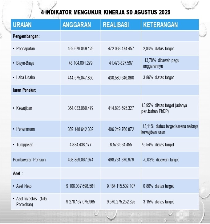 Kewajiban iuran pensiun jatuh tempo sampai dengan bulan Agustus 2025 sebesar Rp. 414.823.695.327,-, penerimaan iuran pensiun Rp. 406.249.760.872,- sehingga terdapat tunggakan iuran sebesar Rp. 8.573.934.455,- lebih tinggi sebesar Rp. 3.689.496.278,- atau 75,54% dari targetnya sebesar Rp. 4.884.438.177,-.