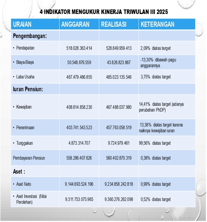 Kewajiban iuran pensiun jatuh tempo sampai dengan Triwulan III-2025 sebesar Rp.467.488.037.980,- dan penerimaan iuran Rp. 457.763.058.519,- sehingga terdapat tunggakan iuran sebesar Rp. 9.724.979.461,- lebih tinggi sebesar Rp. 4.851.664.754,- atau 99,56% dari targetnya untuk periode yang sama sebesar Rp. 4.873.314.707,-