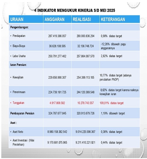 Kewajiban iuran pensiun jatuh tempo sampai dengan bulan Mei 2025 sebesar Rp. 254.399.113.105,- (tunggakan iuran tahun lalu ditambah kewajiban periode berjalan). Sedangkan penerimaan iuran pensiun Rp. 244.120.369.548,- sehingga terdapat tunggakan iuran pensiun Rp. 10.278.743.557,- lebih tinggi sebesar Rp. 5.360.934.975,- atau 109,01% dari targetnya sebesar Rp. 4.917.808.582,-.