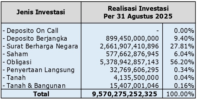 Realisasi hasil investasi yang berhasil dibukukan sampai dengan bulan Agustus 2025 sebesar Rp. 471.783.184.151,- lebih tinggi Rp. 9.427.991.306,-atau 2,04% dari target hasil investasi untuk periode yang sama sebesar Rp. 462.355.192.845,-.