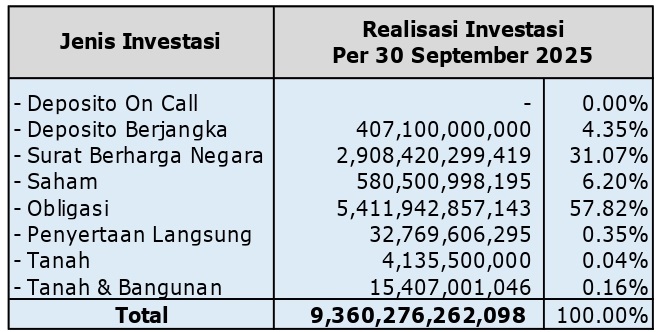 Realisasi hasil investasi yang berhasil dibukukan sampai dengan Triwulan III-2025 sebesar Rp. 528.530.574.245,- lebih tinggi Rp. 10.867.804.278,- atau 2,10% dari target hasil investasi untuk periode yang sama sebesar Rp. 517.662.769.967,-.