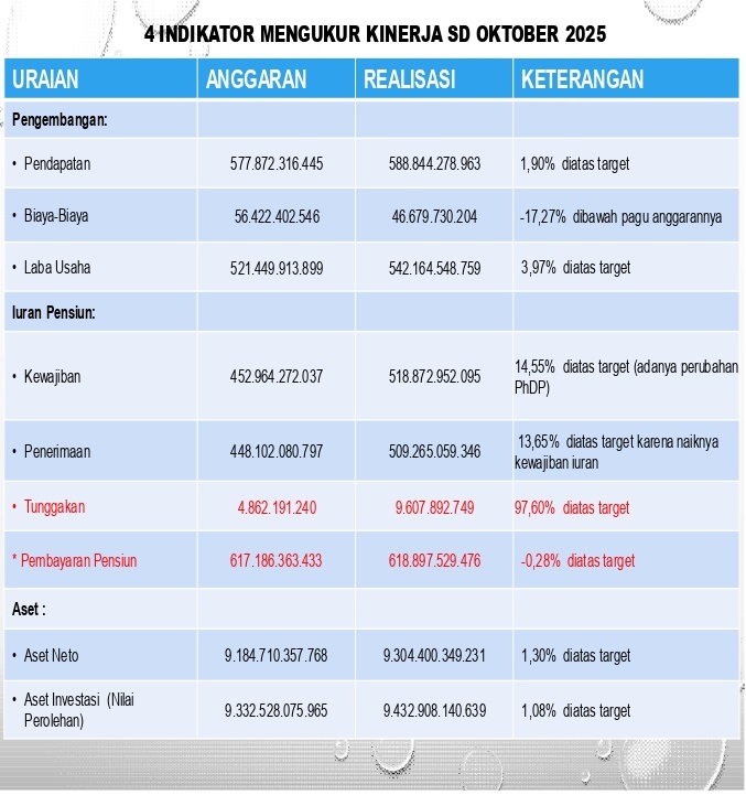Kewajiban iuran pensiun jatuh tempo sampai dengan bulan Oktober 2025 sebesar Rp. 518.872.952.095,-. Sedangkan penerimaan iuran pensiun Rp. 509.265.059.346,- sehingga terdapat tunggakan iuran pensiun sebesar Rp. 9.607.892.749,- lebih tinggi sebesar Rp. 4.745.701.509,- atau 97,60% dari targetnya sebesar Rp. 4.862.191.240,-.