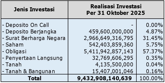Realisasi hasil investasi yang berhasil dibukukan sampai dengan bulan Oktober 2025 sebesar Rp. 588.487.253.466,- lebih tinggi Rp. 11.022.546.548,- atau 1,91% dari target hasil investasi untuk periode yang sama sebesar Rp. 577.464.706.918,-.
